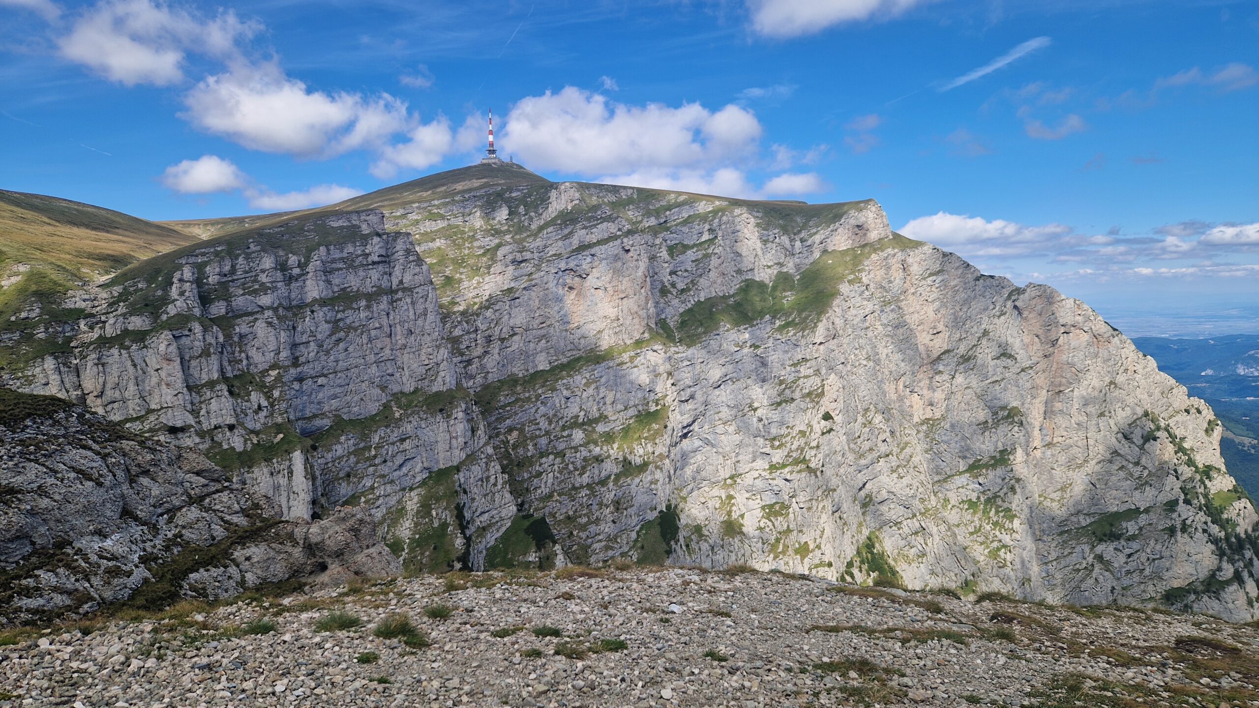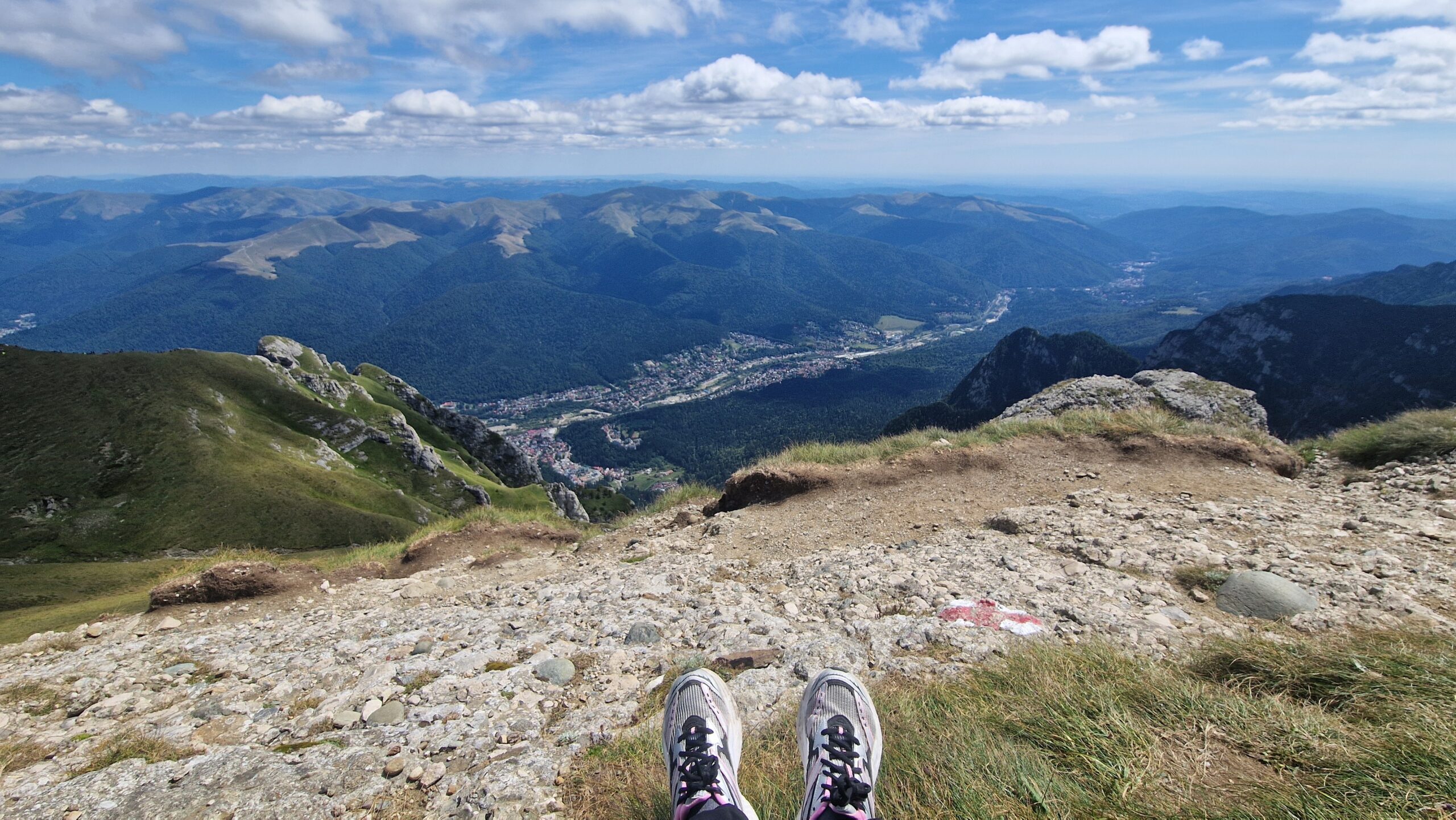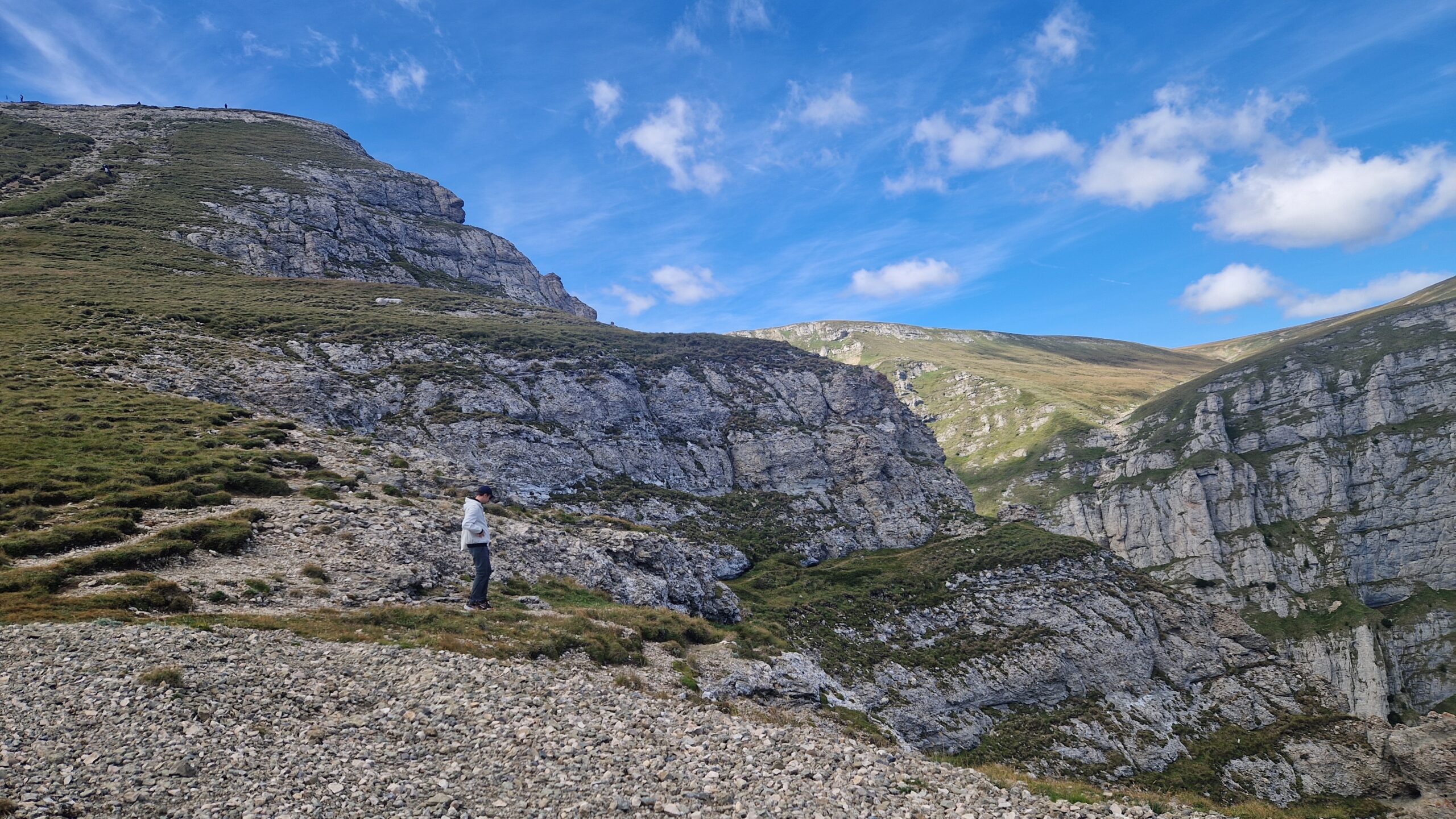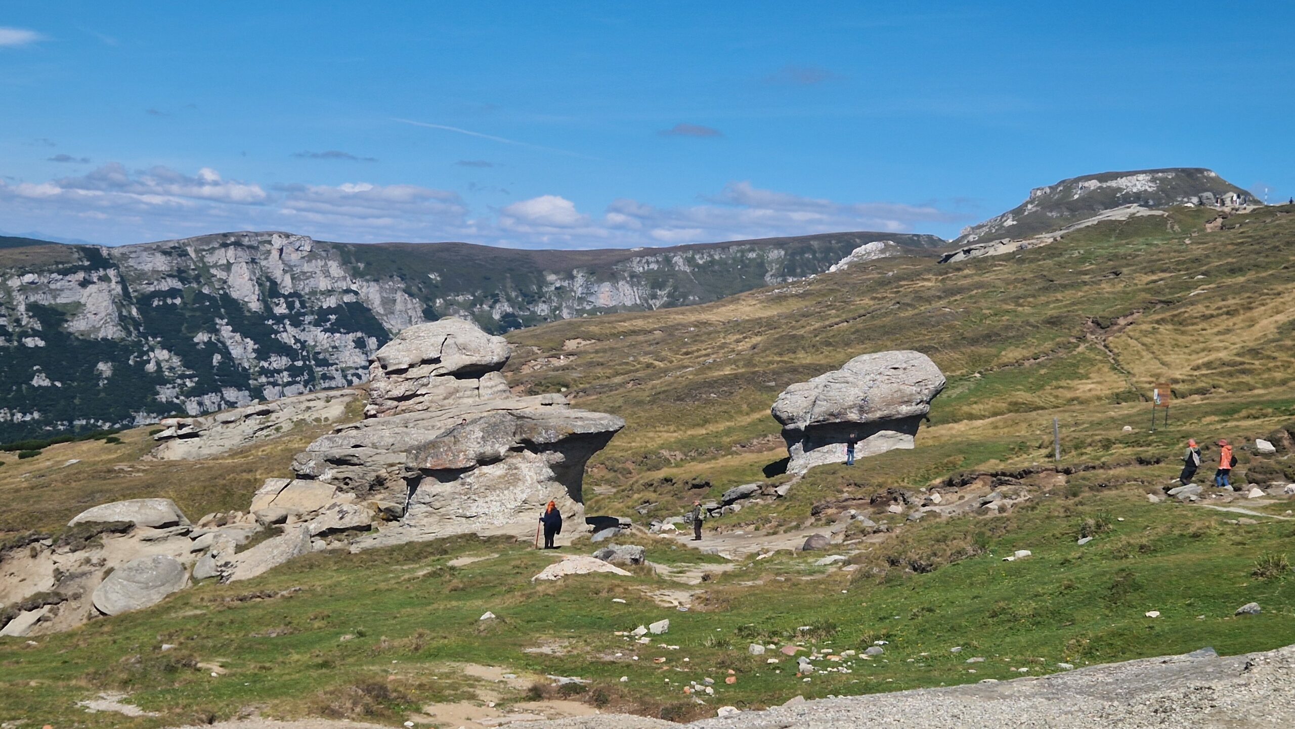 🇷🇴 Pohorie Bucegi, ktoré je jeho súčasťou má podmanivý horský hrebeň, na ktorý sa dá v pohode dostať lanovkou. A tak vo výške 2300m, kráčajúc po zelenej tráve so slnkom nad hlavou, hľadeli sme na vzdialené vrcholky pohorí Južných Karpát, nazývaných aj Transylvánskymi Alpami a na skalnaté útvary naopak stojace priamo pred nami.